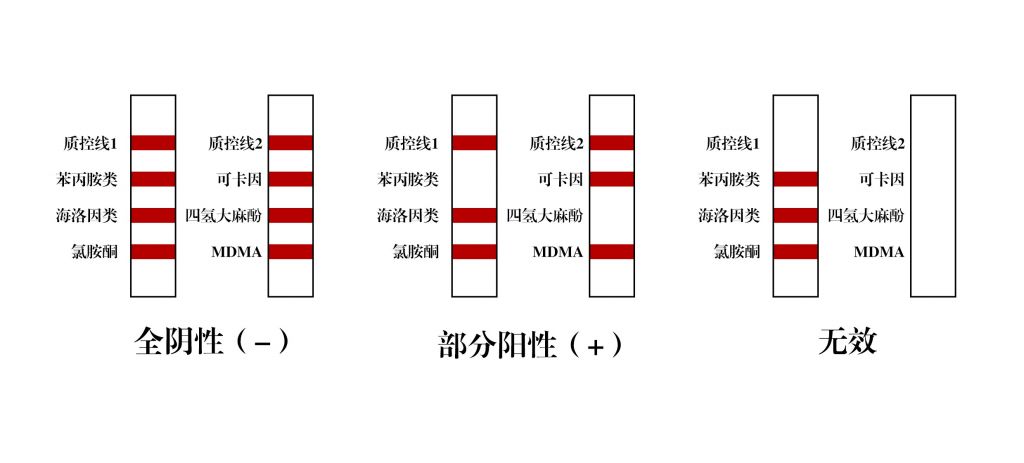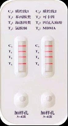 圖示說明:C1、C2為質(zhì)控線,T1-T6為檢測線分別表示:苯丙胺類(T1)、海洛因類(T2)、氯胺酮(T3)、可卡因(T4)、大麻(T5)、搖頭丸(T6)。